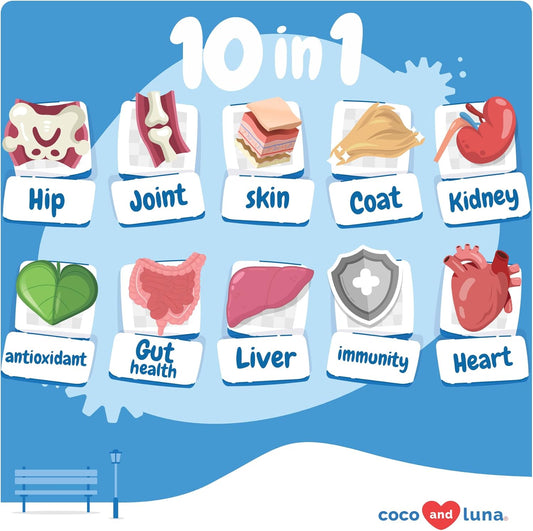 10 in 1 Multivitamin for Dogs - Glucosamine Chondroitin for Joint Support + Digestive Enzymes & Probiotics - Cod Liver Oil & Vitamins with Coq10 for Skin & Heart Health, Gut & Immune Support